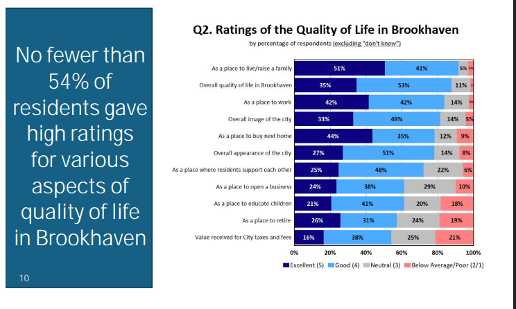 Brookhaven was rated significantly higher than the Southeast regional and U.S. averages in most categories of city services assessed, with numbers in the 80 percent range compared with 50 percent in the other two categories, the survey revealed.