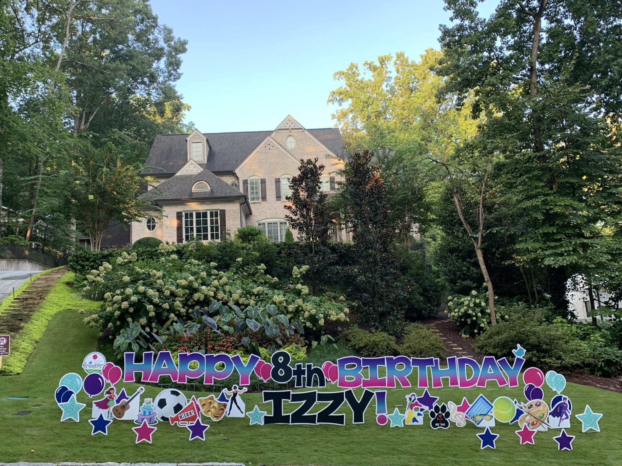The vast majority of customers ask for the signs to be set up facing the street, not their own home. Francombe said she thinks a factor is that people want to take a social-media-worthy souvenir photo of the sign in front of their home. The placement also has the effect of make the sign “speak” to neighbors and passers-by, inviting them to join in the celebration from afar and enjoy the colorful display.