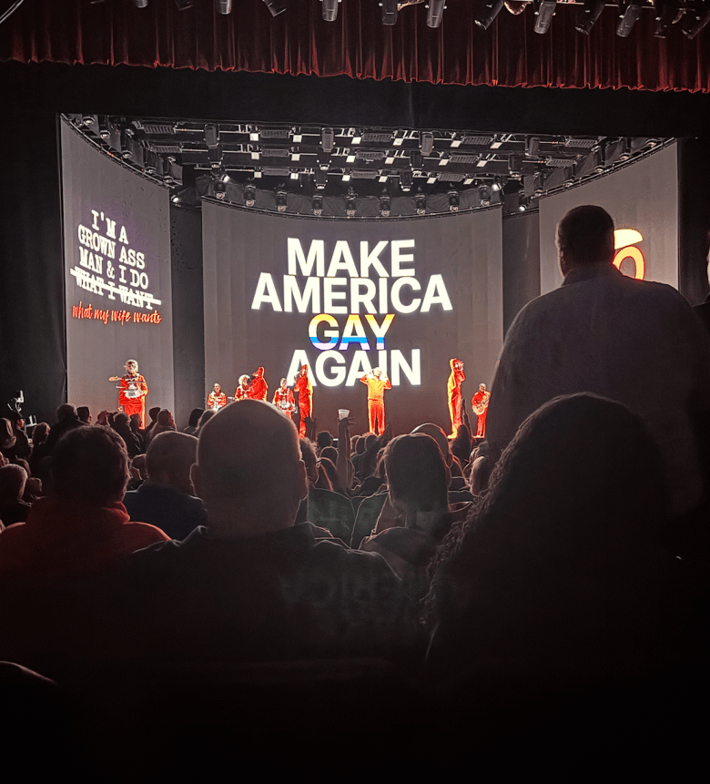 Drone footage of an Atlanta suburb, photos from the soaring atrium at the Marriott Marquis in Downtown, and a projected “Atlanta Kicks Ass” message helped ground the show in the city. There was also a political undertone to the show as a montage of protestors pushing back against ICE raids and the message “Make America Gay Again” brought cheers from an already charged-up audience.
