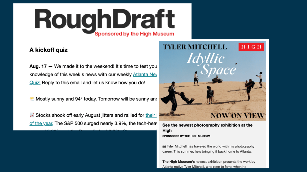 There are display, text, and sponsored content options available for email. Read about Rough Draft newsletter sponsorships here.